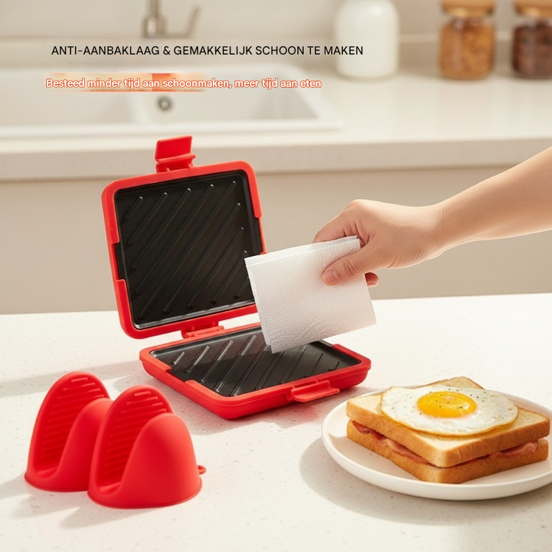 De CrispyChef™ doet alles wat een tostiapparaat doet, maar dan slimmer. De speciale anti-aanbakplaten zorgen ervoor dat je eten direct loslaat, zelfs als de kaas overloopt. Omdat je de magnetron gebruikt, is er geen voorverwarmtijd nodig en bespaar je kostbare minuten. Het resultaat is precies zoals je het wilt: goudbruin en knapperig, maar dan zonder de vette vingers en de berg afwas achteraf.
