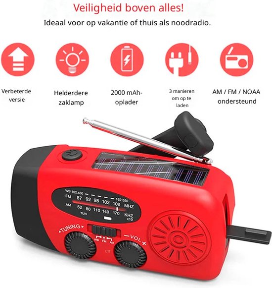 • Altijd stroom, ook zonder elektriciteit – Werkt op zonne-energie, handslinger en USB-oplading.