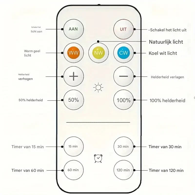 Bediening vanaf de bank – Pas de helderheid aan of zet de timer aan met de meegeleverde afstandsbediening.